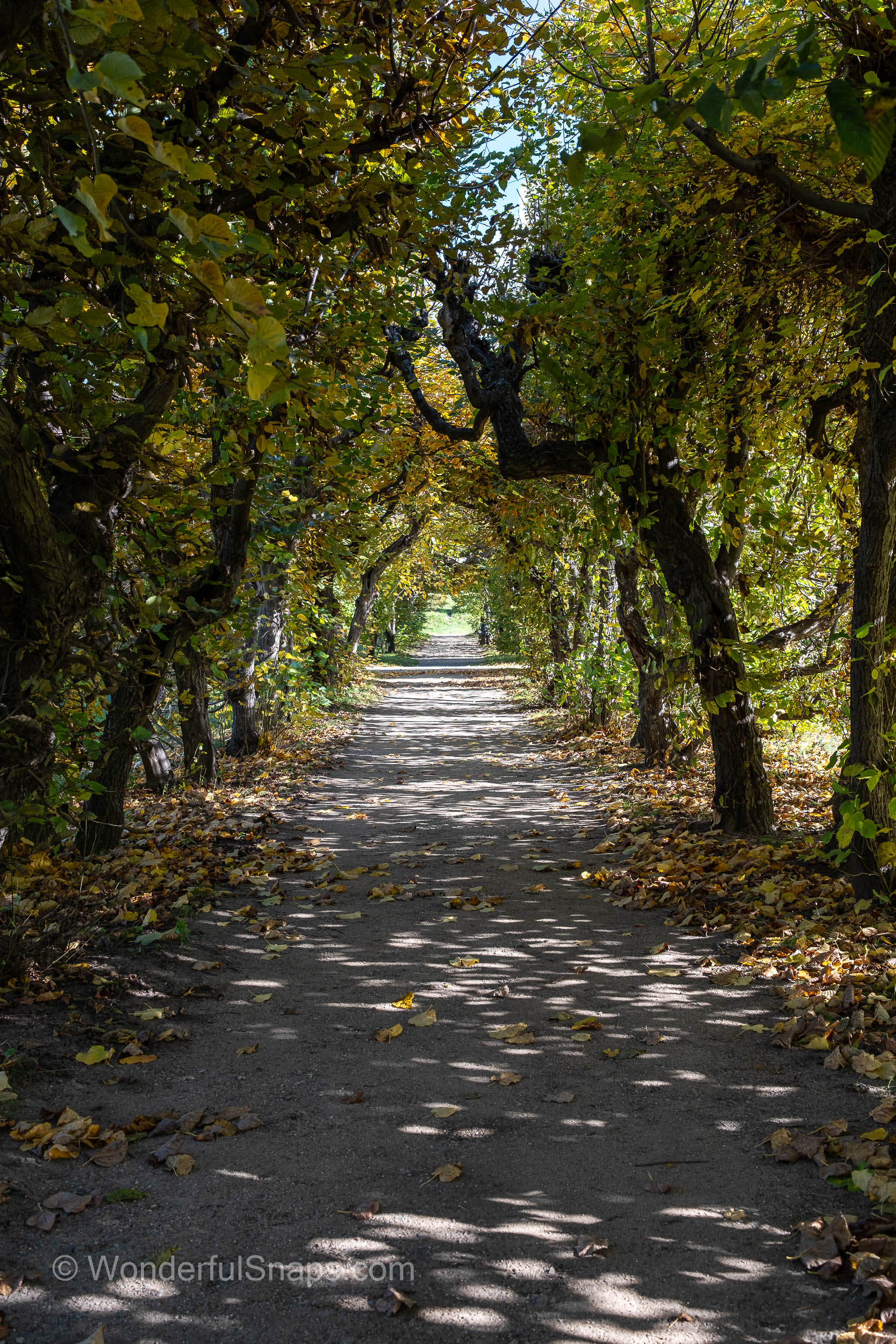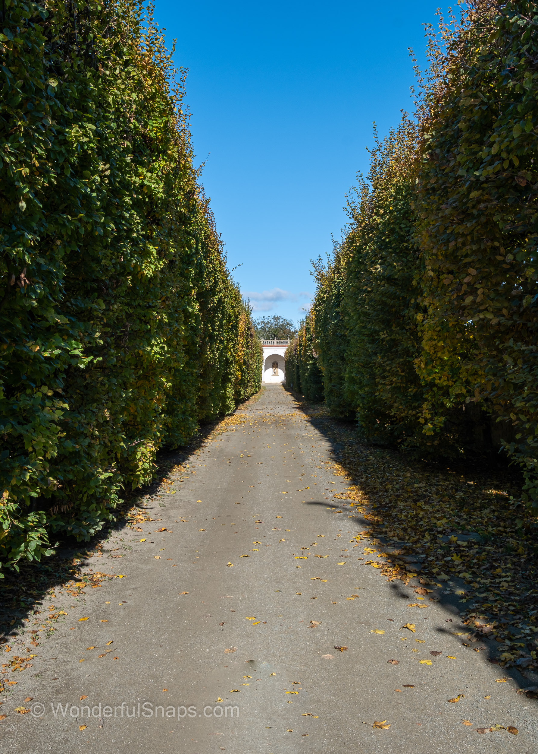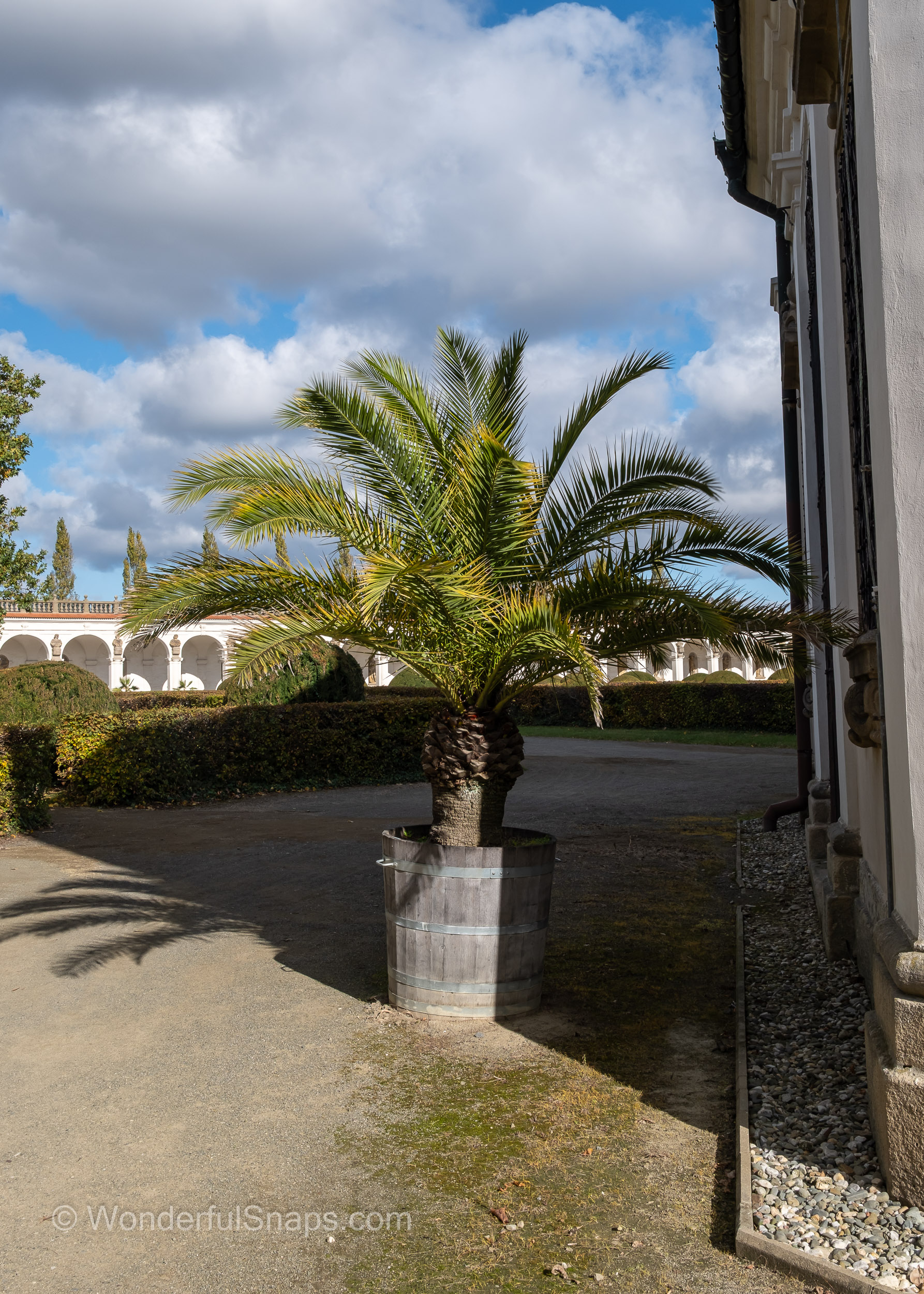 Even the smaller details contribute to the garden's character. Potted palm trees in rustic wooden barrels line the gravel paths near the buildings, evoking a sense of the exotic that was highly prized by the nobility who once walked here. As autumn sets in, the golden leaves scattered across the pathways add a layer of warmth to the cool, grey stone of the arcades and the long, balustrade gallery.