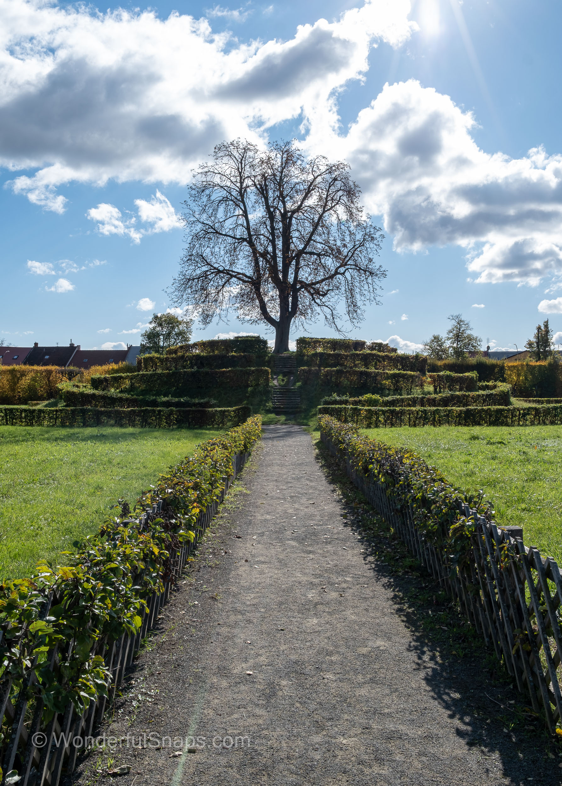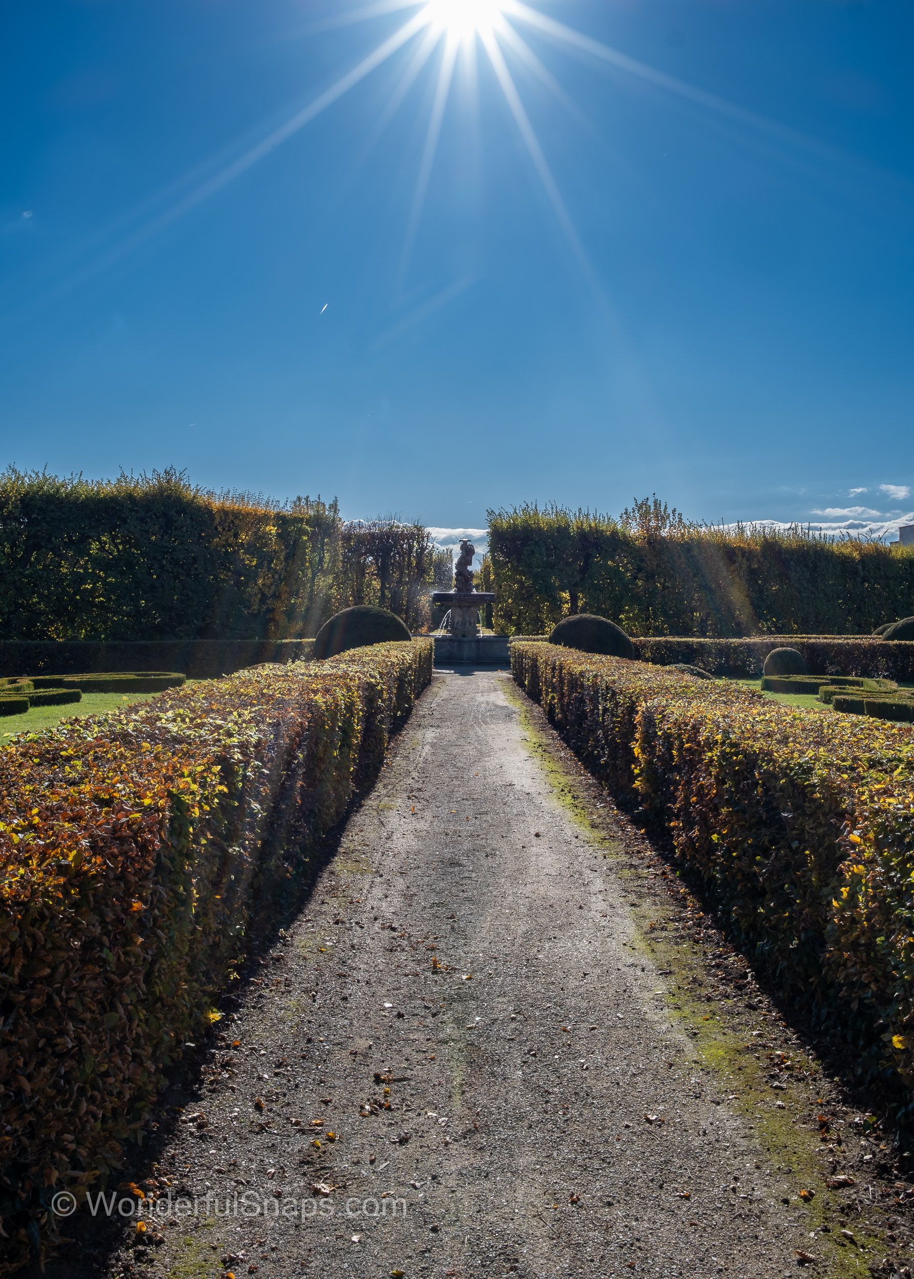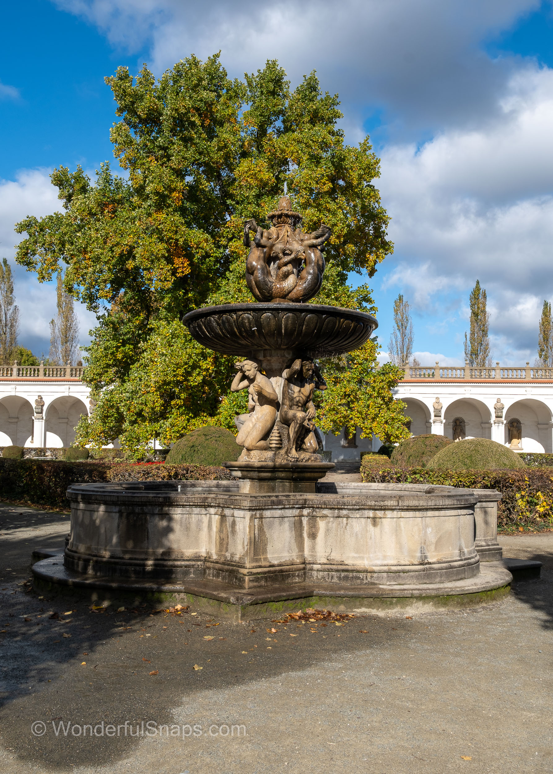 Even the smaller details contribute to the garden's character. Potted palm trees in rustic wooden barrels line the gravel paths near the buildings, evoking a sense of the exotic that was highly prized by the nobility who once walked here. As autumn sets in, the golden leaves scattered across the pathways add a layer of warmth to the cool, grey stone of the arcades and the long, balustrade gallery.
