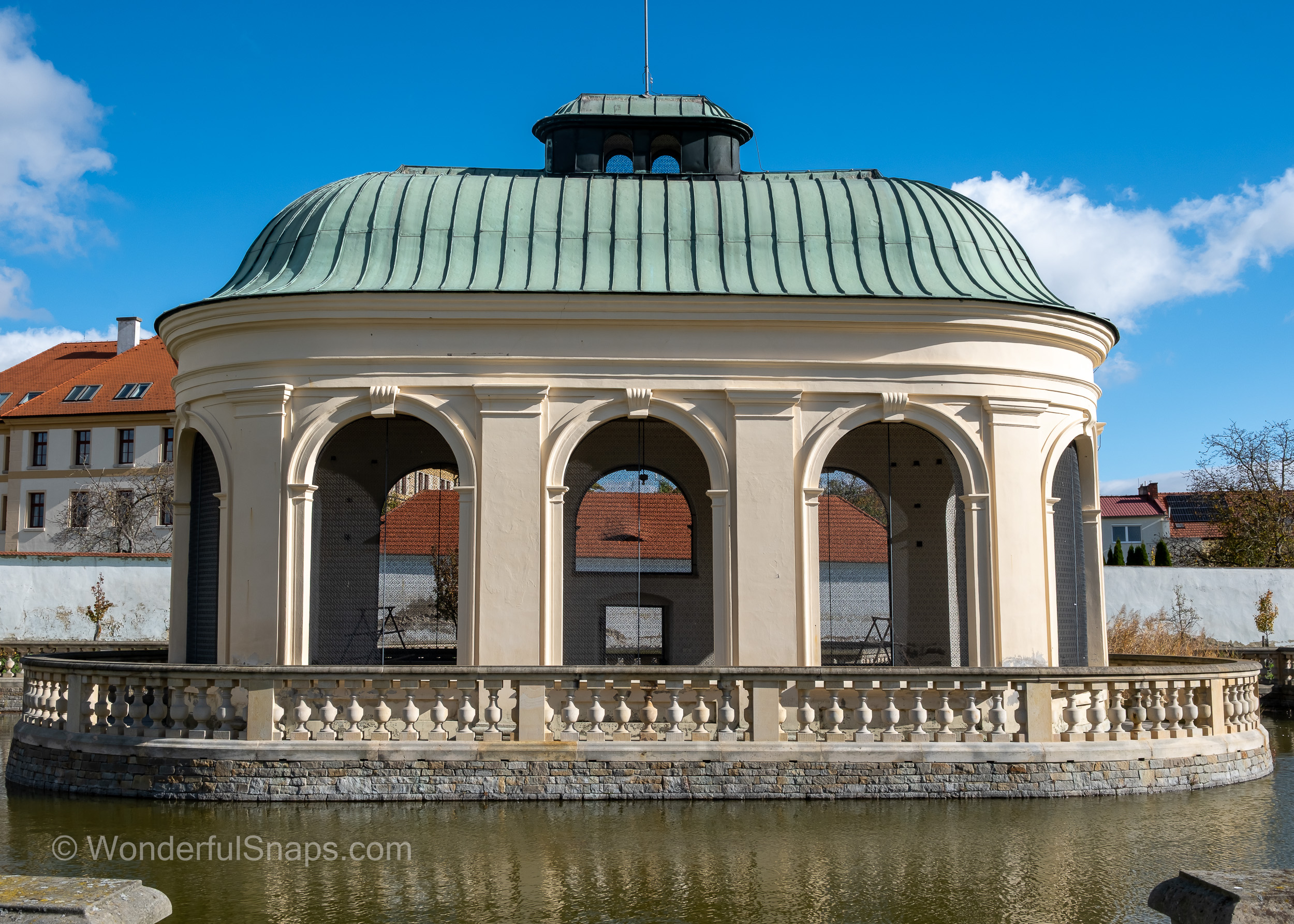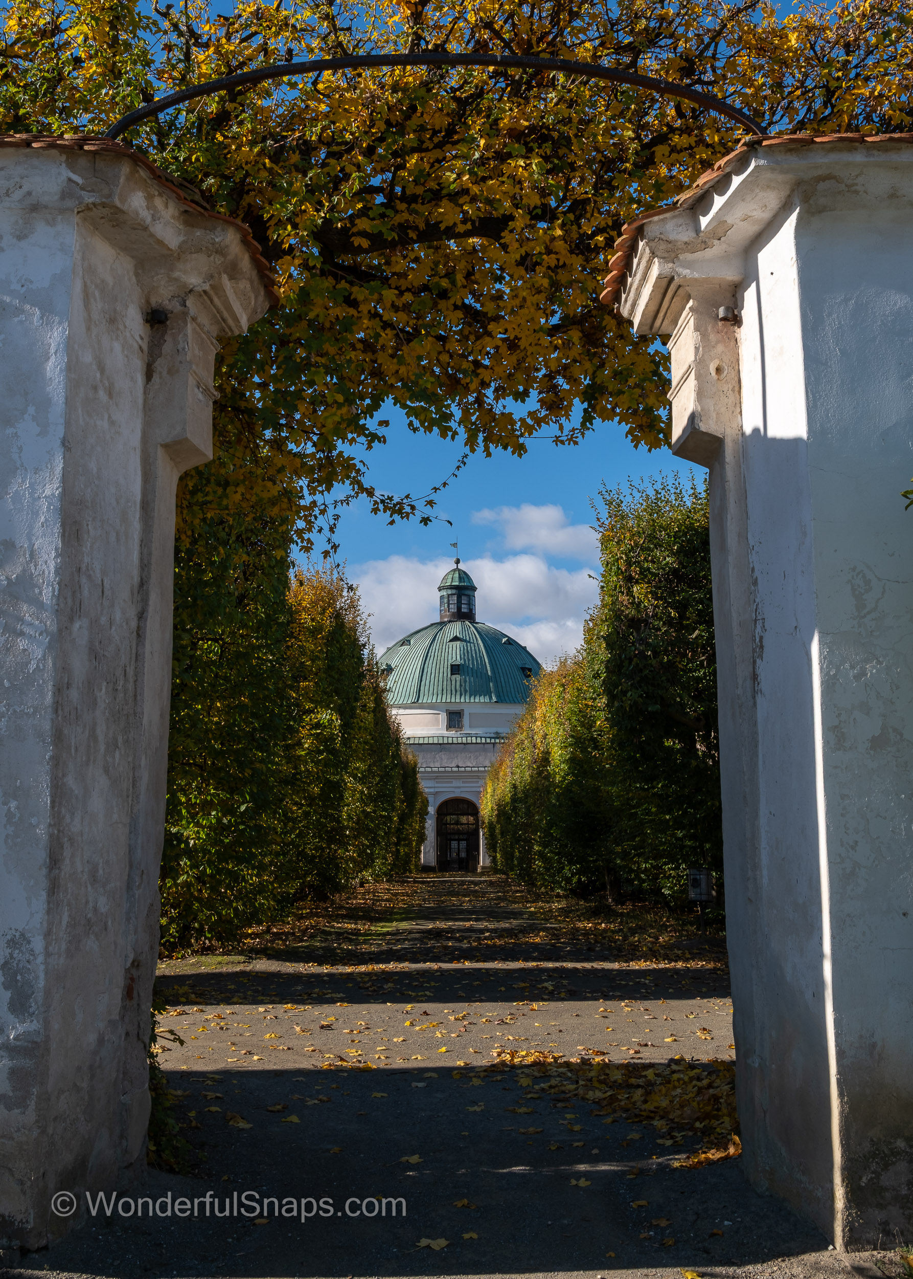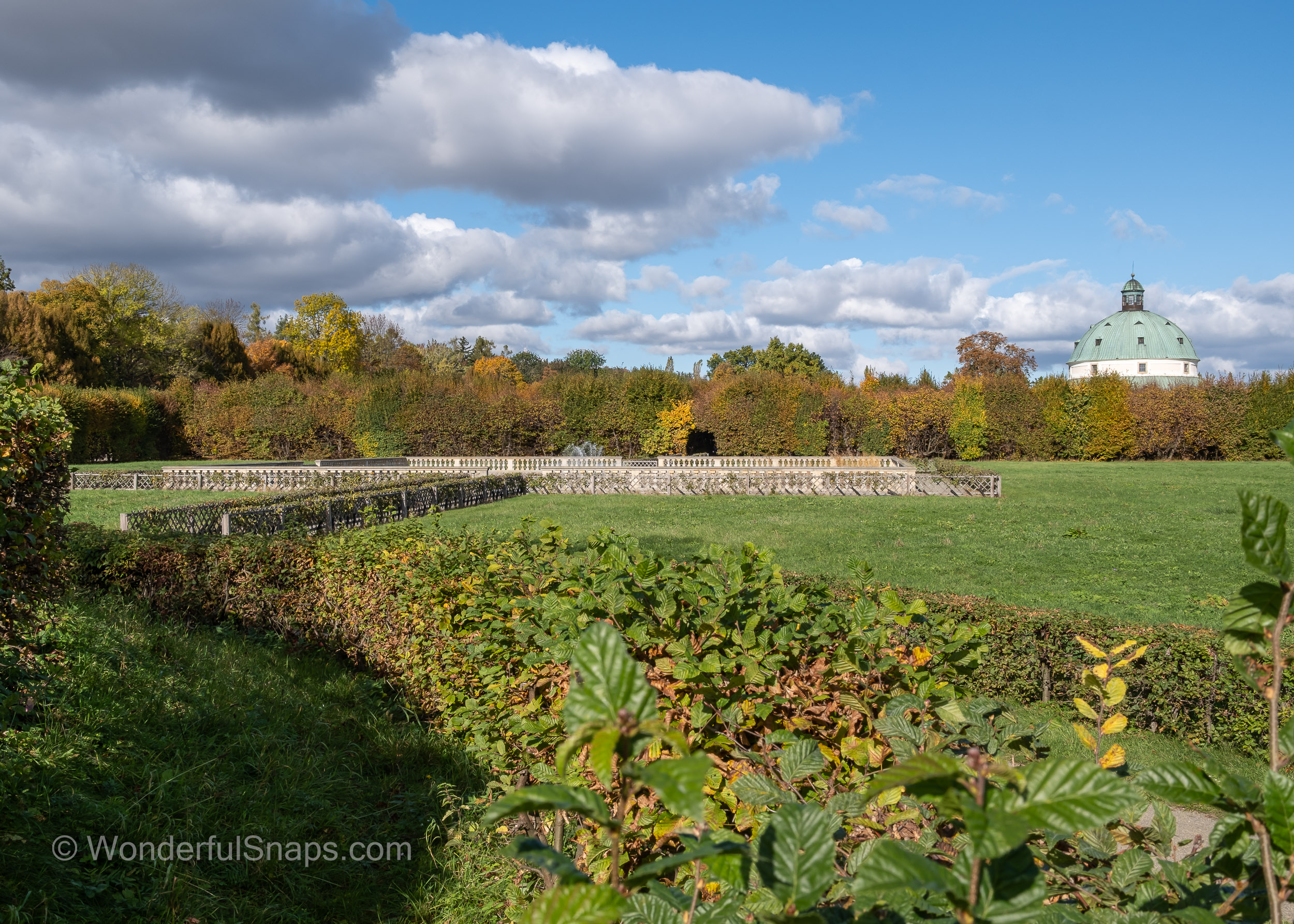 At the heart of the garden lies the magnificent Rotunda. Its teal-domed roof is a focal point that anchors the entire landscape. Framed perfectly by tall, shaded walkways and archways of turning autumn leaves, the building serves as a testament to the architectural ambition of the era. Inside, it houses Foucault’s pendulum, but from the outside, it is simply a masterpiece of classical proportions that draws the eye from every corner of the grounds.