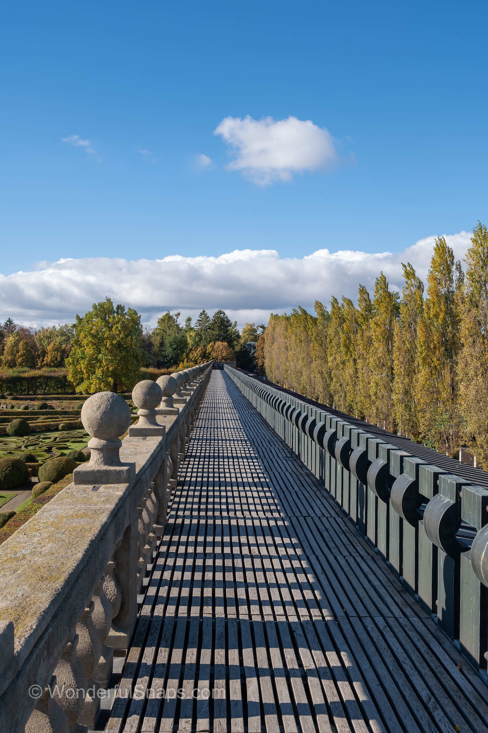 Upon entering, the most striking feature is the incredible sense of symmetry. The garden is defined by its meticulous topiary, with low boxwood hedges clipped into intricate, swirling patterns that resemble living lace against the green lawns. From the elevated perspective of the long colonnade, these patterns reveal their full mathematical beauty, stretching out toward a horizon punctuated by the silhouettes of the town’s historic spires.