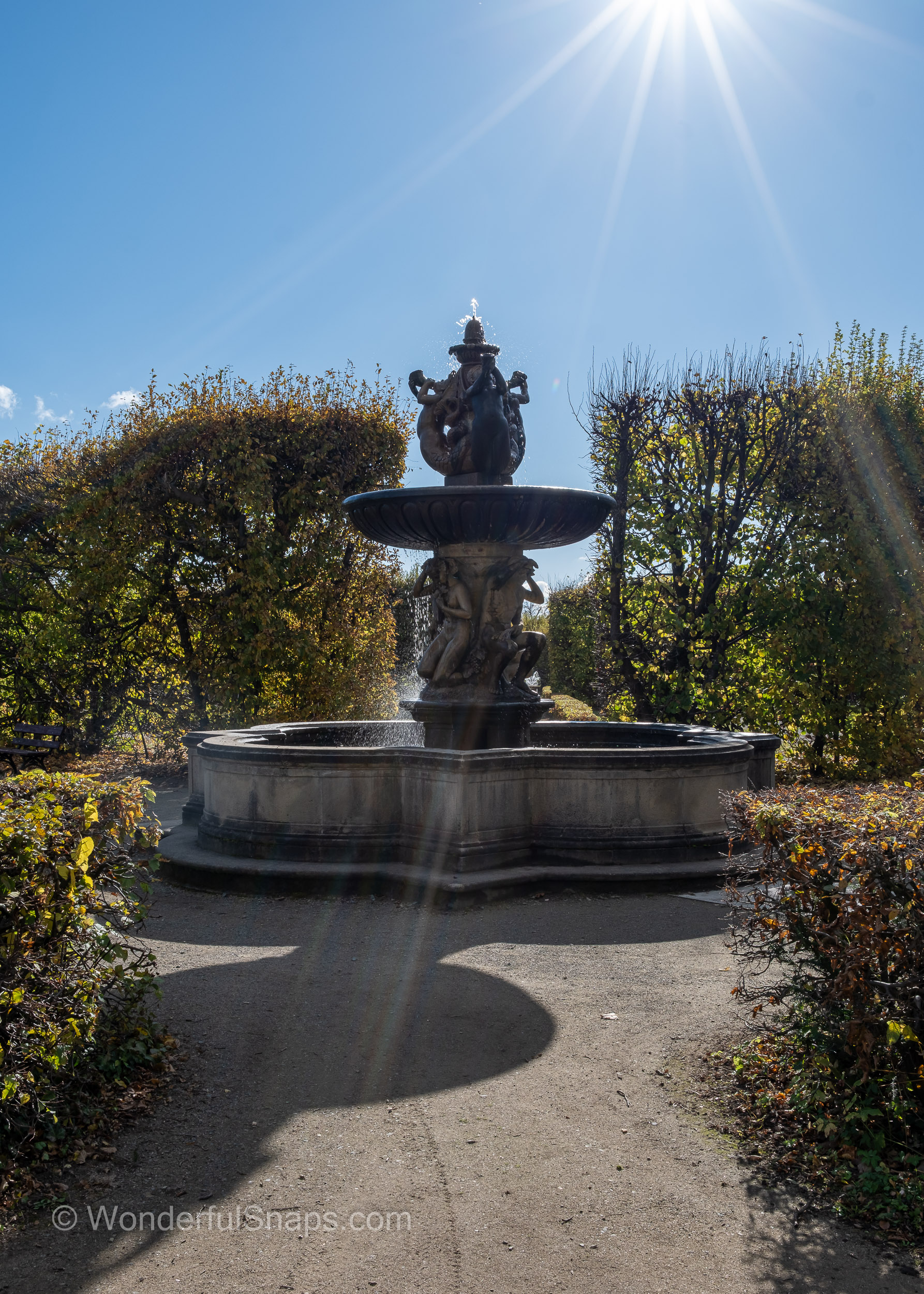Water also plays a vital role in the garden’s atmosphere. Ornate stone fountains, featuring mythological figures and sea creatures, provide a rhythmic soundscape as water splashes into weathered basins. These statues, darkened by time, offer a beautiful contrast to the bright, open spaces and the vibrant green of the surrounding foliage.
