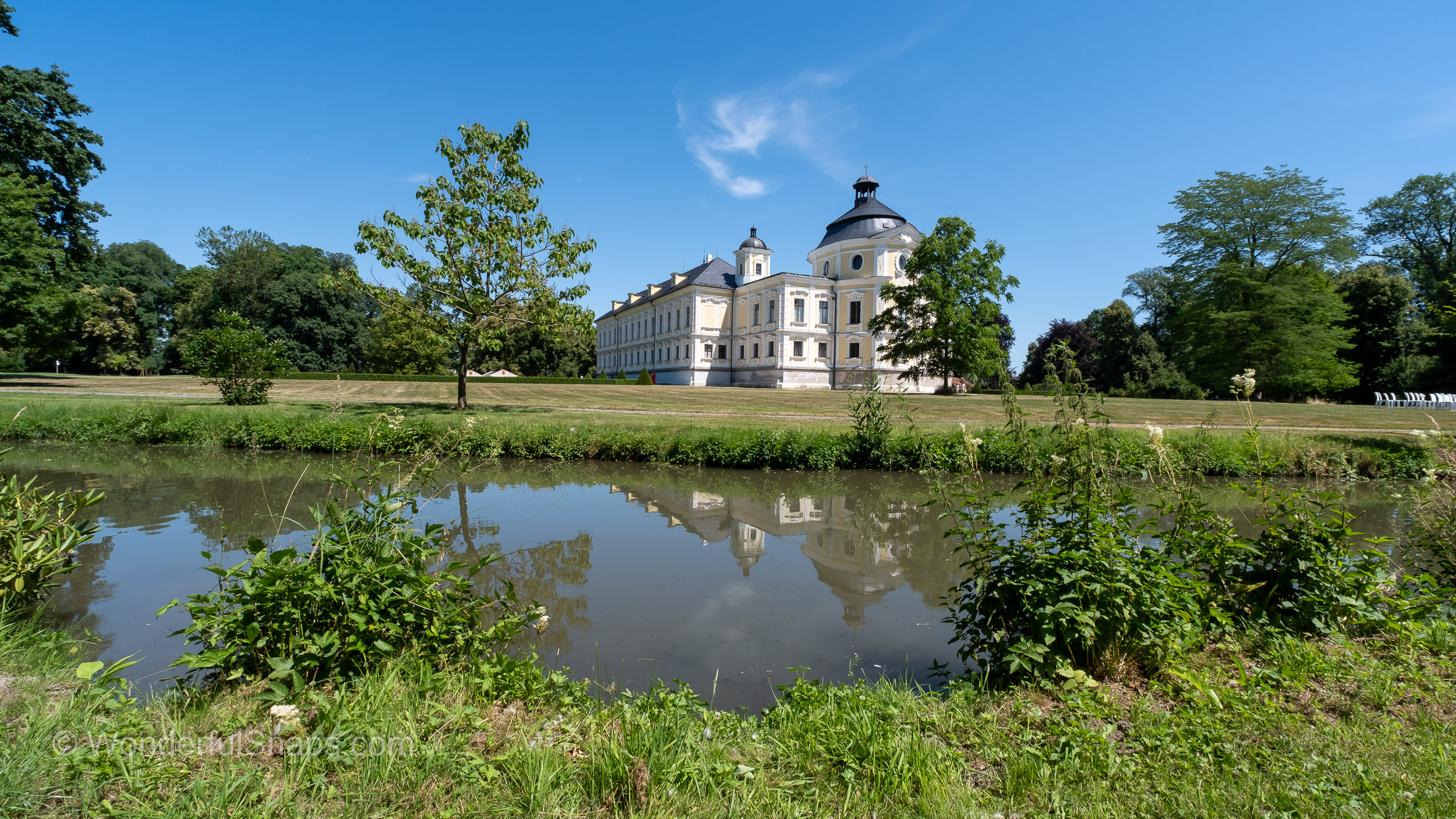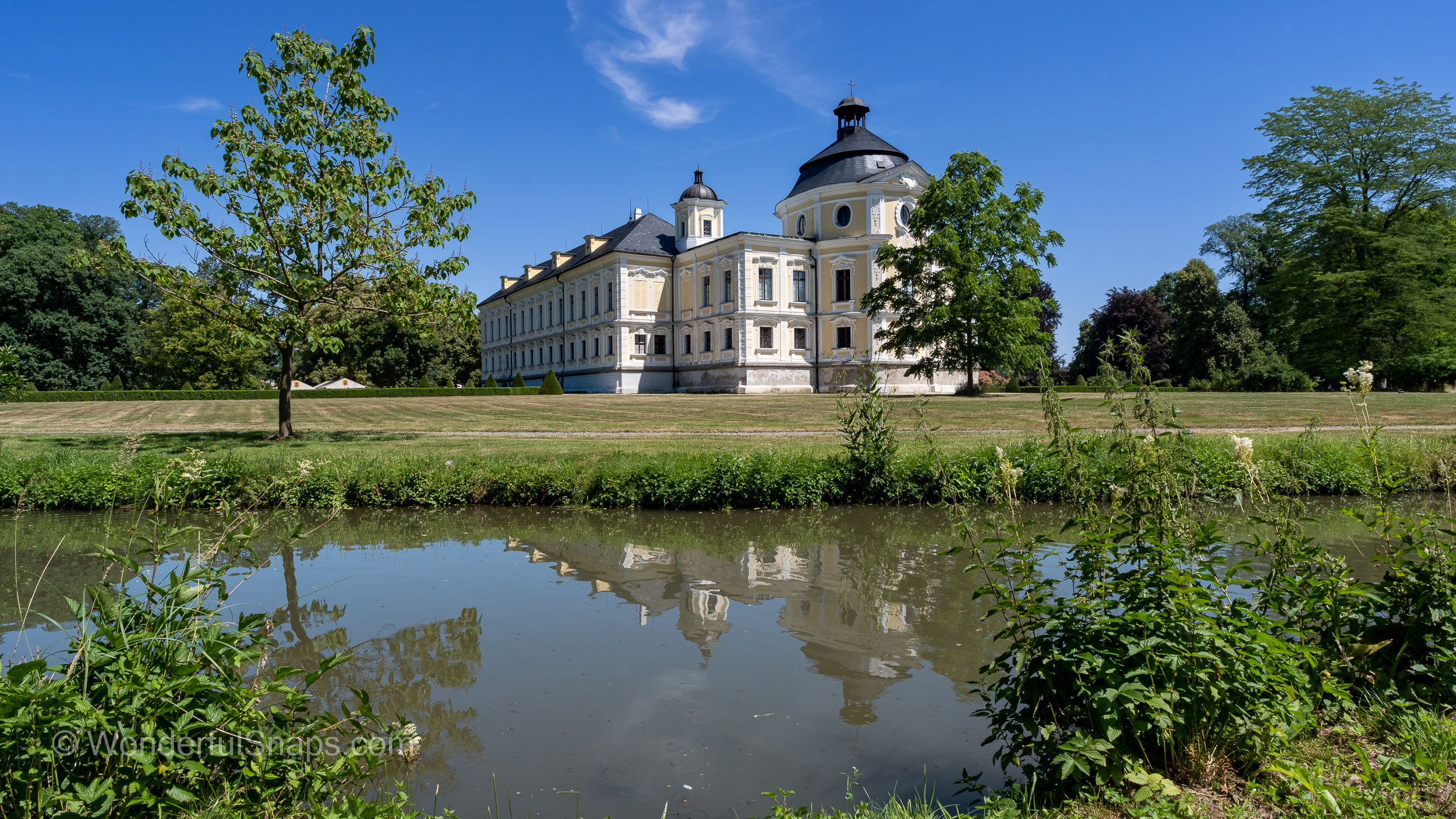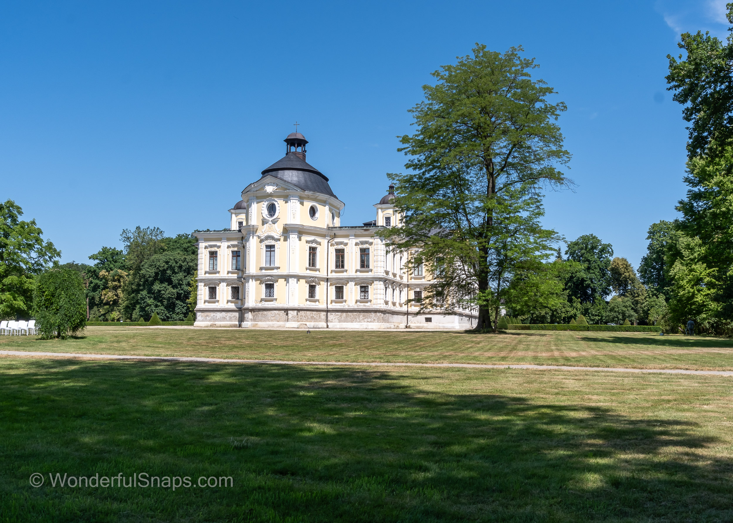 The photographs capture the serene beauty of Kravare Chateau, a distinguished Baroque residence set within a spacious historic landscape in the Silesian region of the Czech Republic. The chateau's delicate yellow and white facade, crowned with its characteristic dome, stands out against the vivid blue sky, lending the entire composition a sense of calm refinement. Designed with classical symmetry and ornate sculptural detailing, the building reflects the grandeur of noble life while maintaining a peaceful, almost secluded atmosphere.