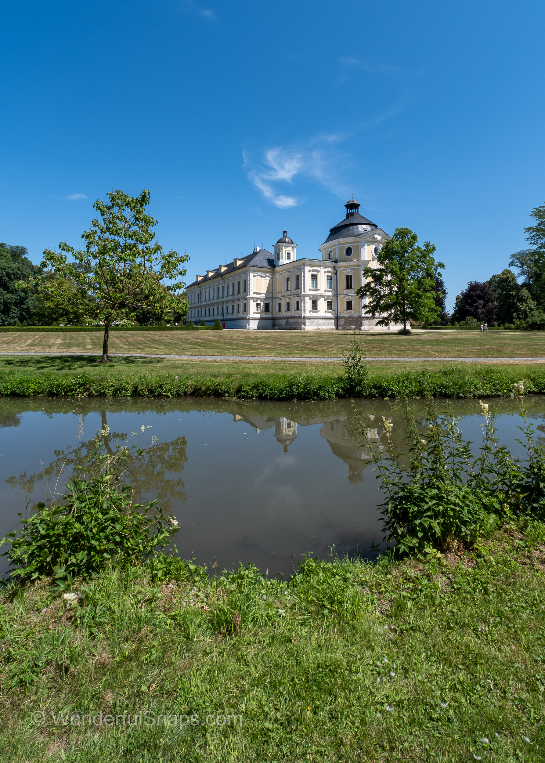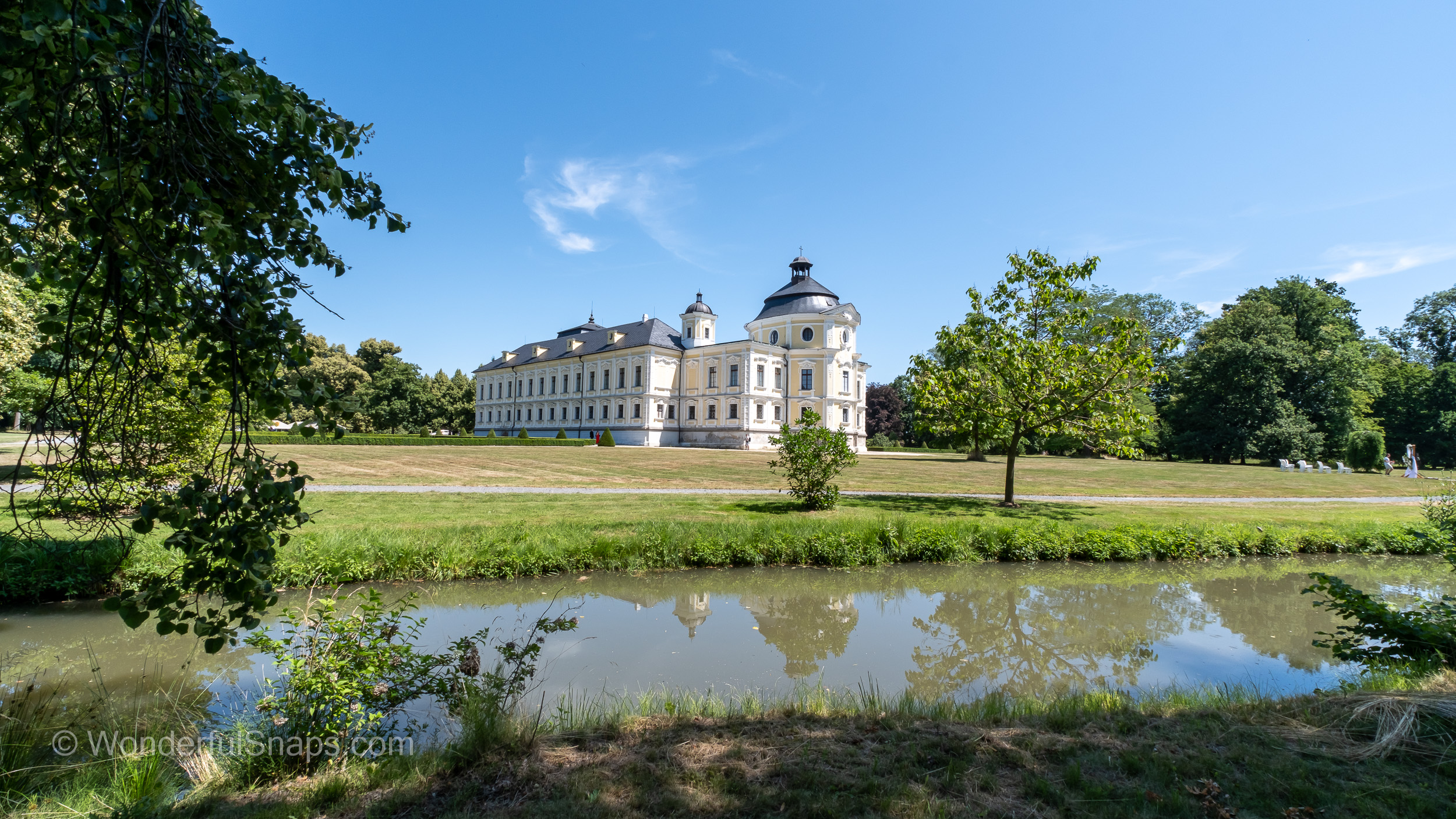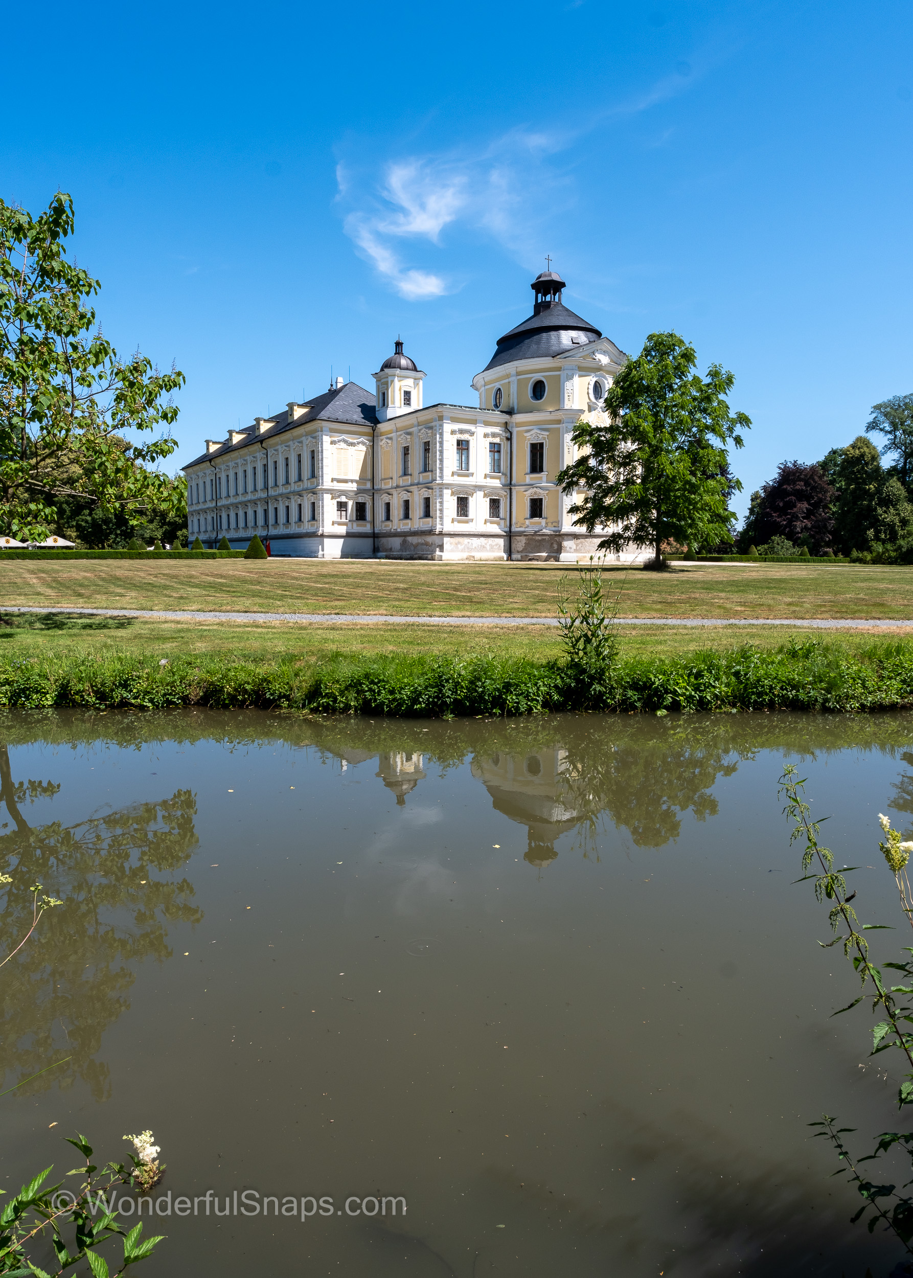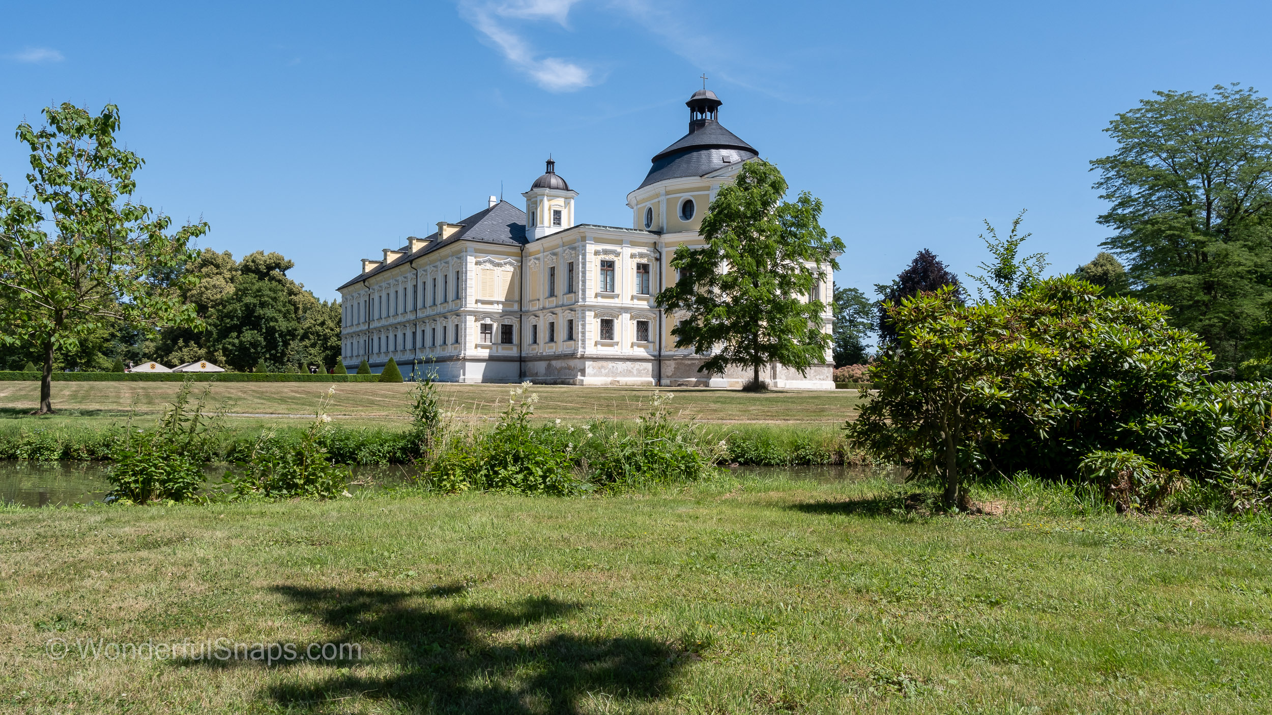 The photographs capture the serene beauty of Kravare Chateau, a distinguished Baroque residence set within a spacious historic landscape in the Silesian region of the Czech Republic. The chateau's delicate yellow and white facade, crowned with its characteristic dome, stands out against the vivid blue sky, lending the entire composition a sense of calm refinement. Designed with classical symmetry and ornate sculptural detailing, the building reflects the grandeur of noble life while maintaining a peaceful, almost secluded atmosphere.
