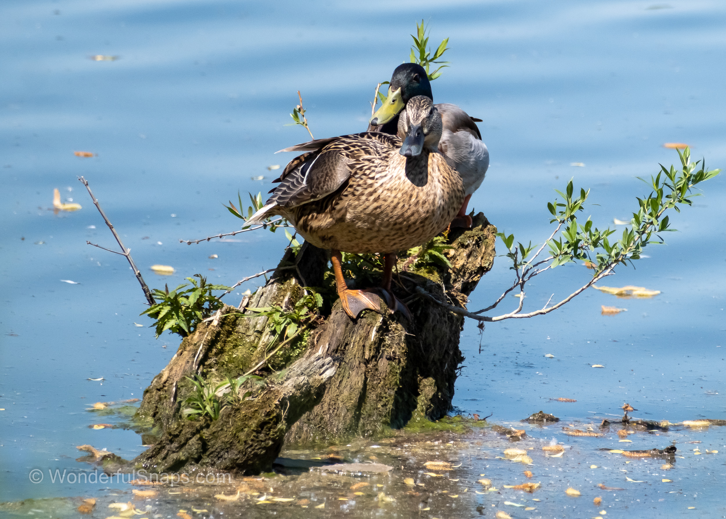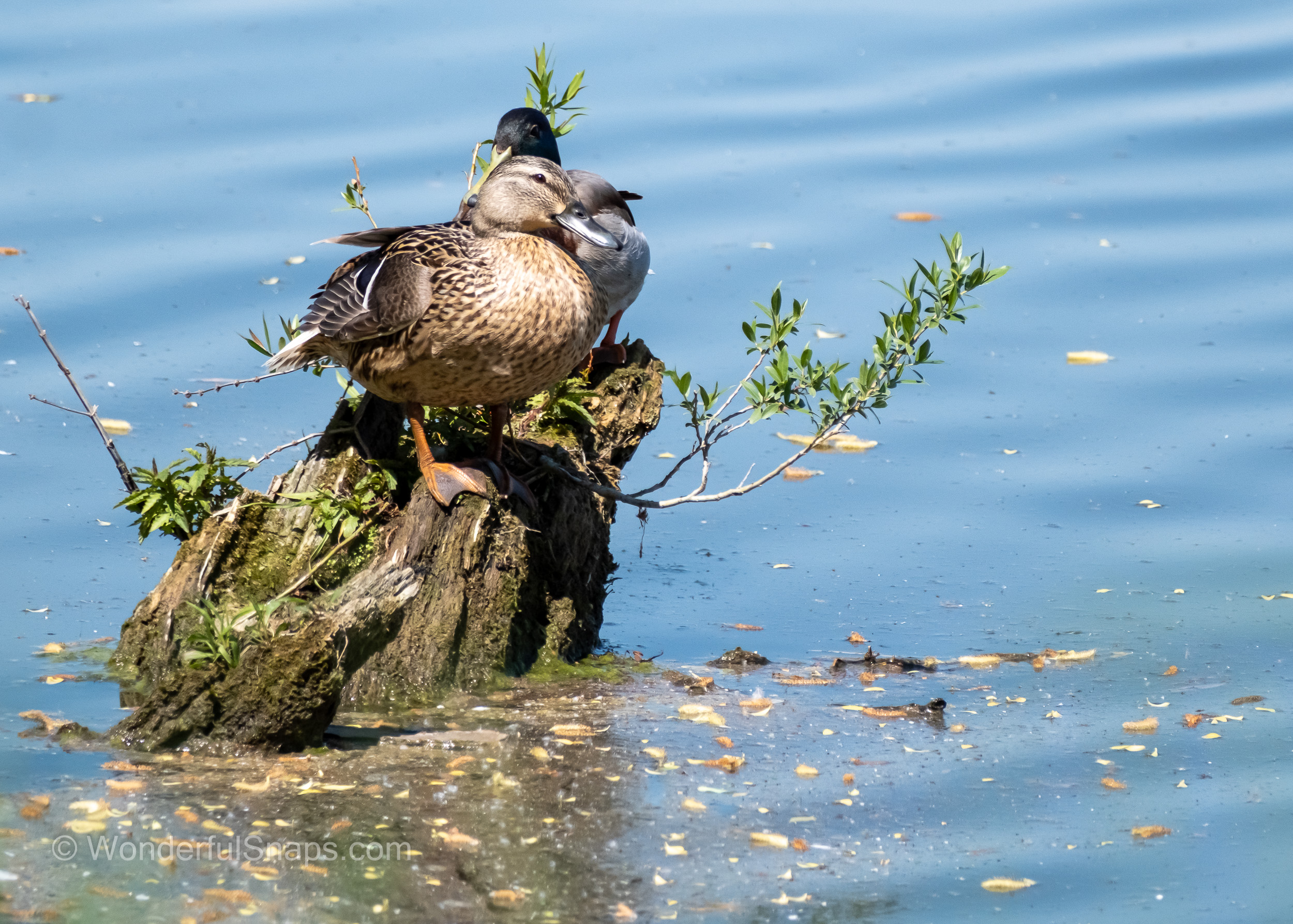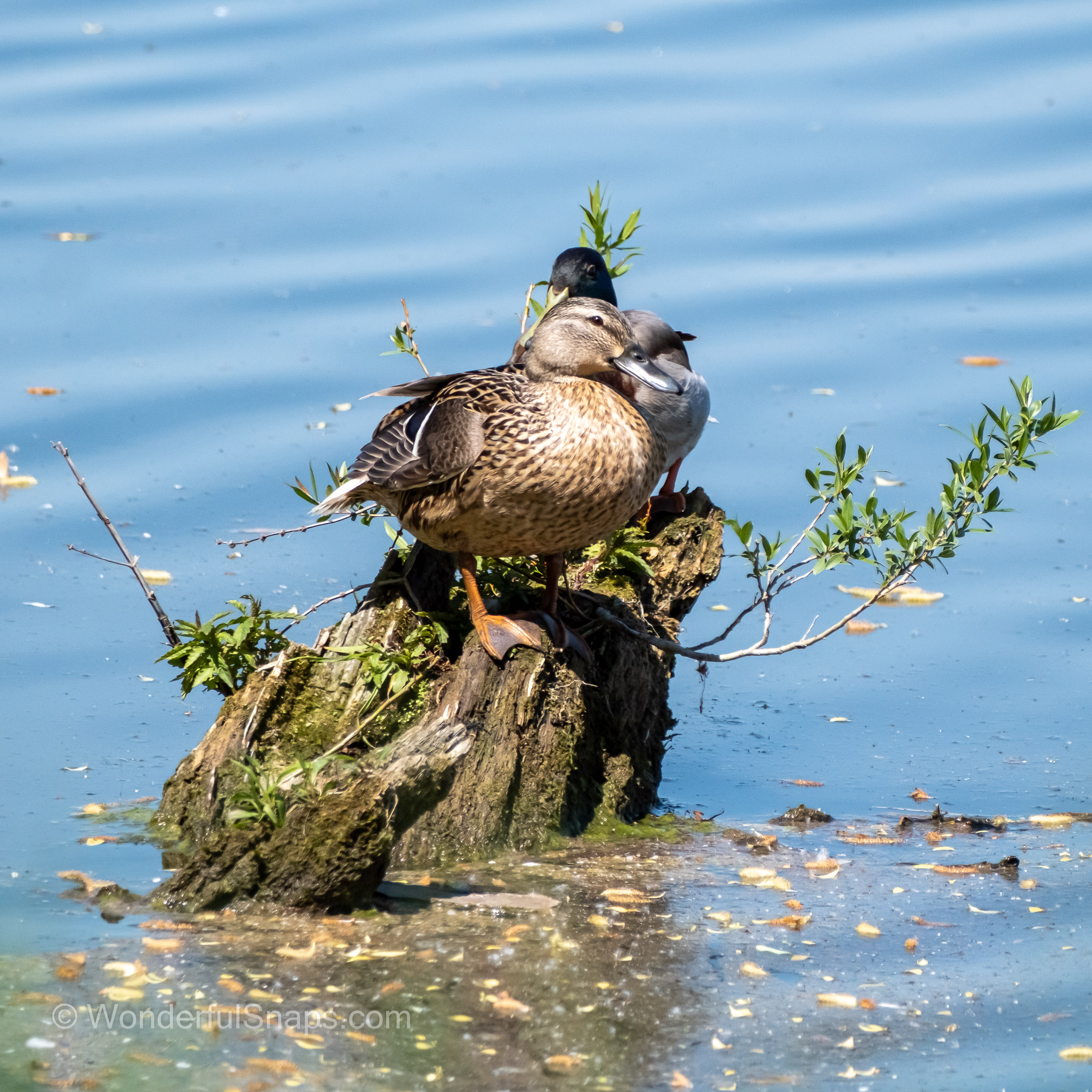 The serene waters near Dubnany provide a perfect sanctuary for a bustling congregation of wild ducks, as captured in this charming series of photographs. The scene is one of harmonious activity, set against a backdrop of calm, reflective water and soft, natural light. A large, mixed flock is visible, primarily composed of mallards, with the iconic glossy green heads and white neck rings of the drakes standing out vividly against the more subdued, mottled brown plumage of the hens. They are gathered closely, some resting placidly on the water's surface while others engage in gentle preening, a sign of comfort and security in their environment.