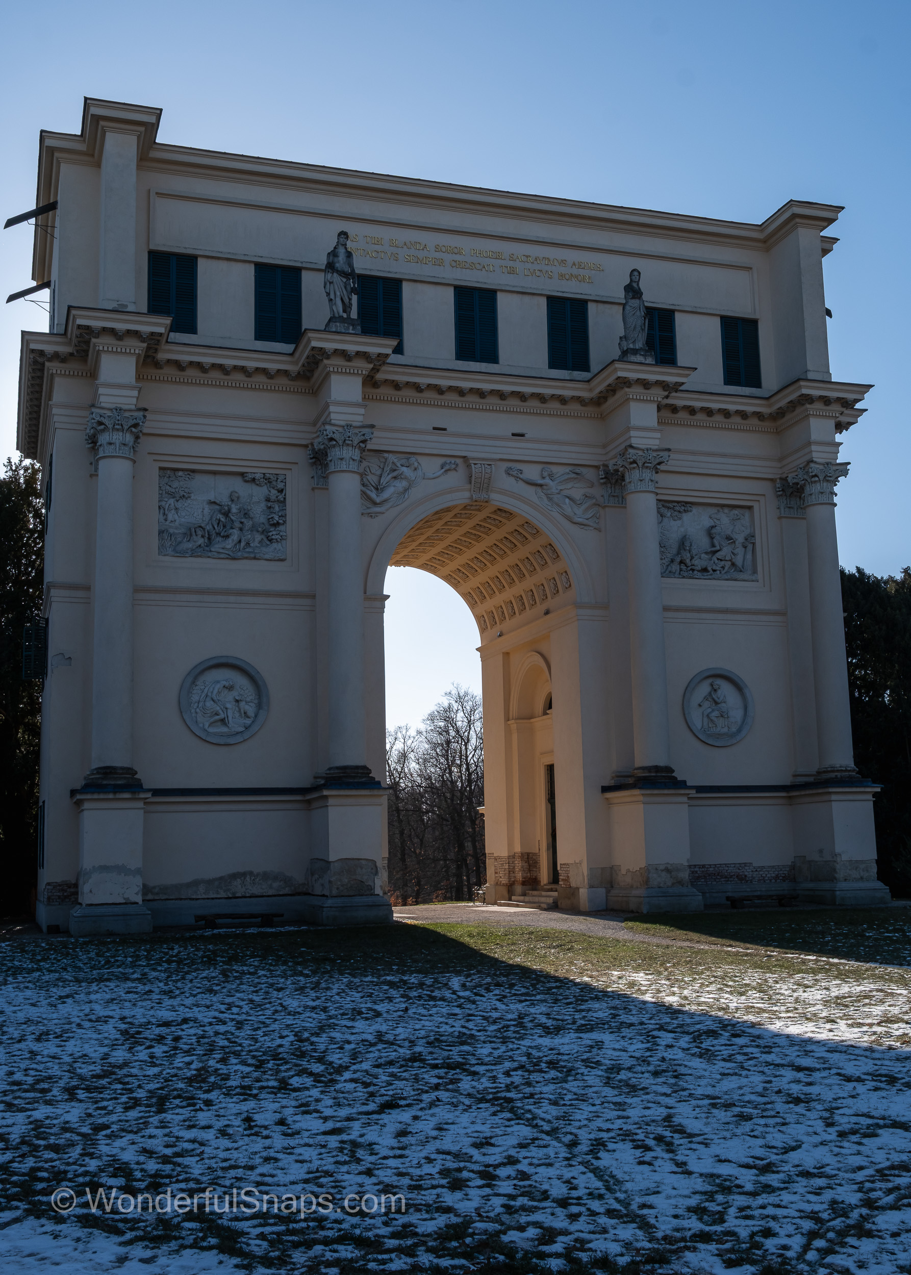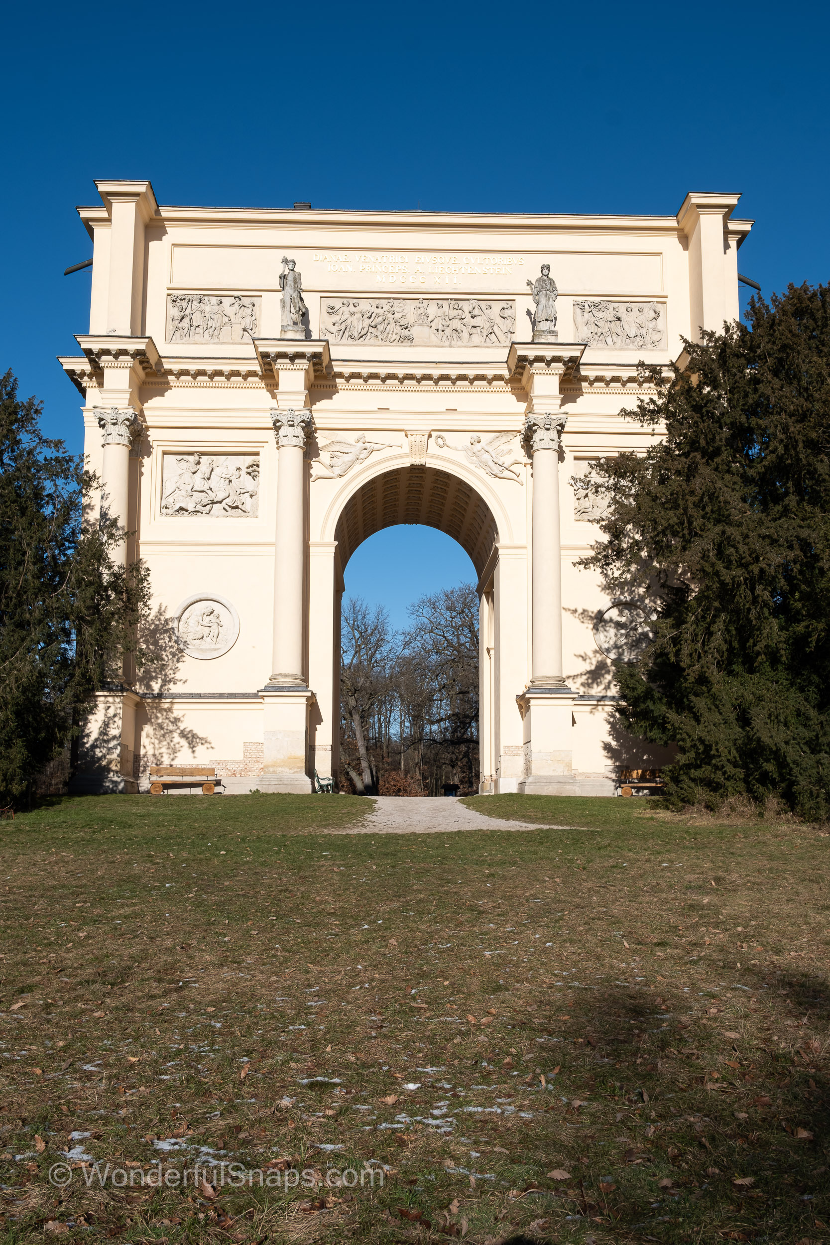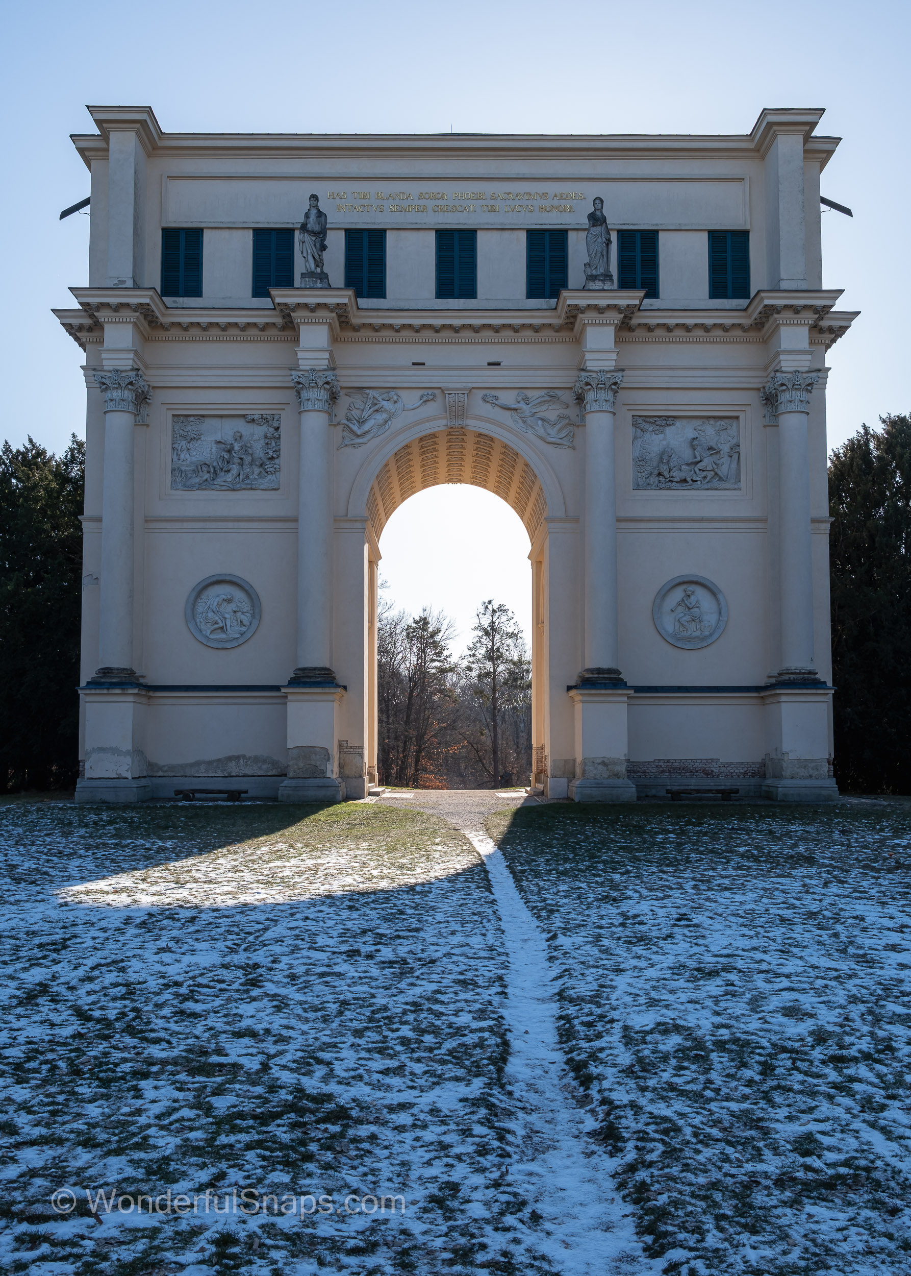 Built at the turn of the 19th century as part of the Lednice–Valtice cultural landscape, the structure reflects the romantic ideals of its time. Sculpted reliefs, columns and statues appear almost sculptural in the low winter light, their pale stone contrasting gently with the blue sky and dark tree lines. The long shadow cast through the central arch draws the eye forward, inviting the visitor to step through and follow the path into the quiet forest behind.