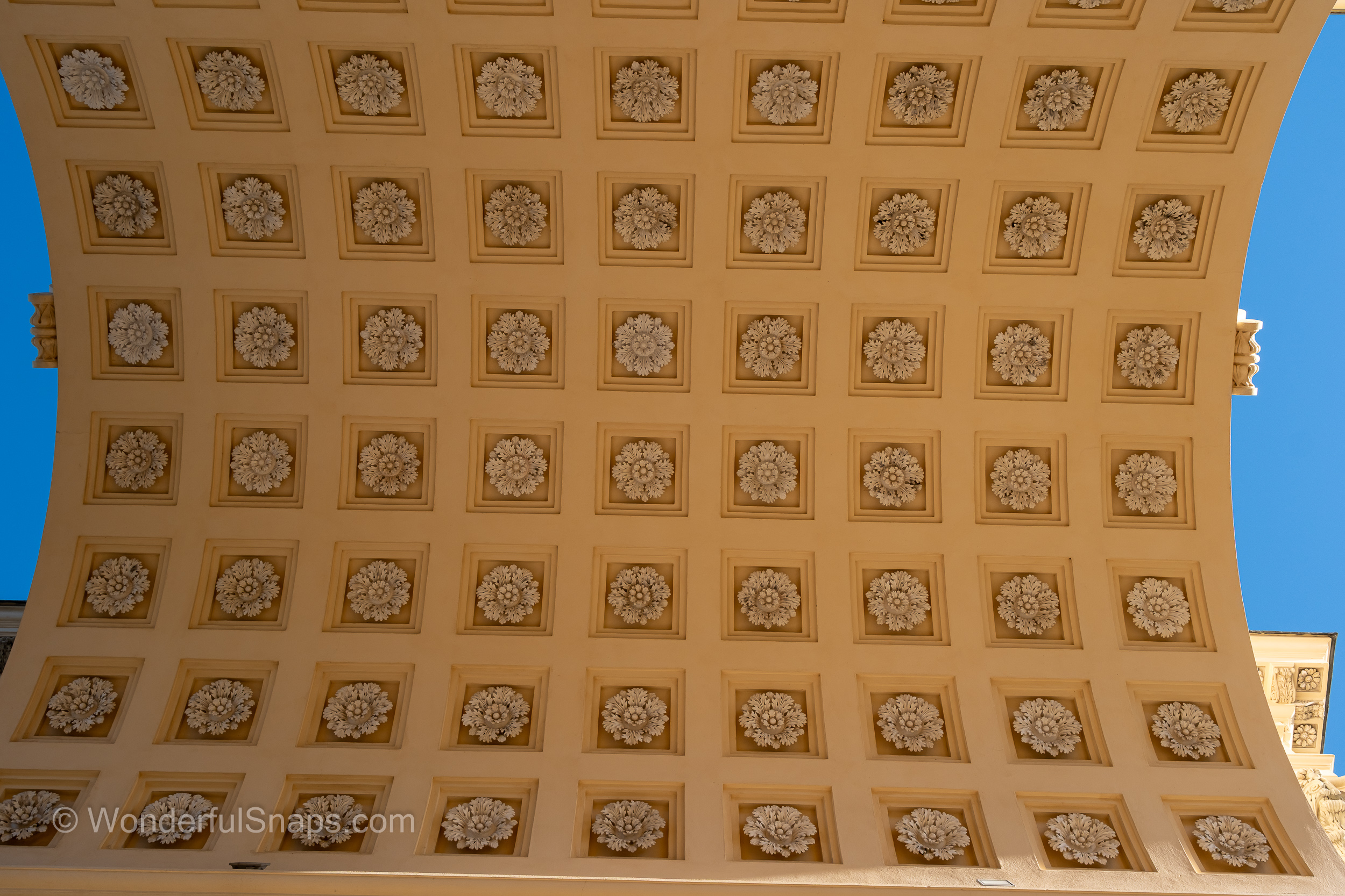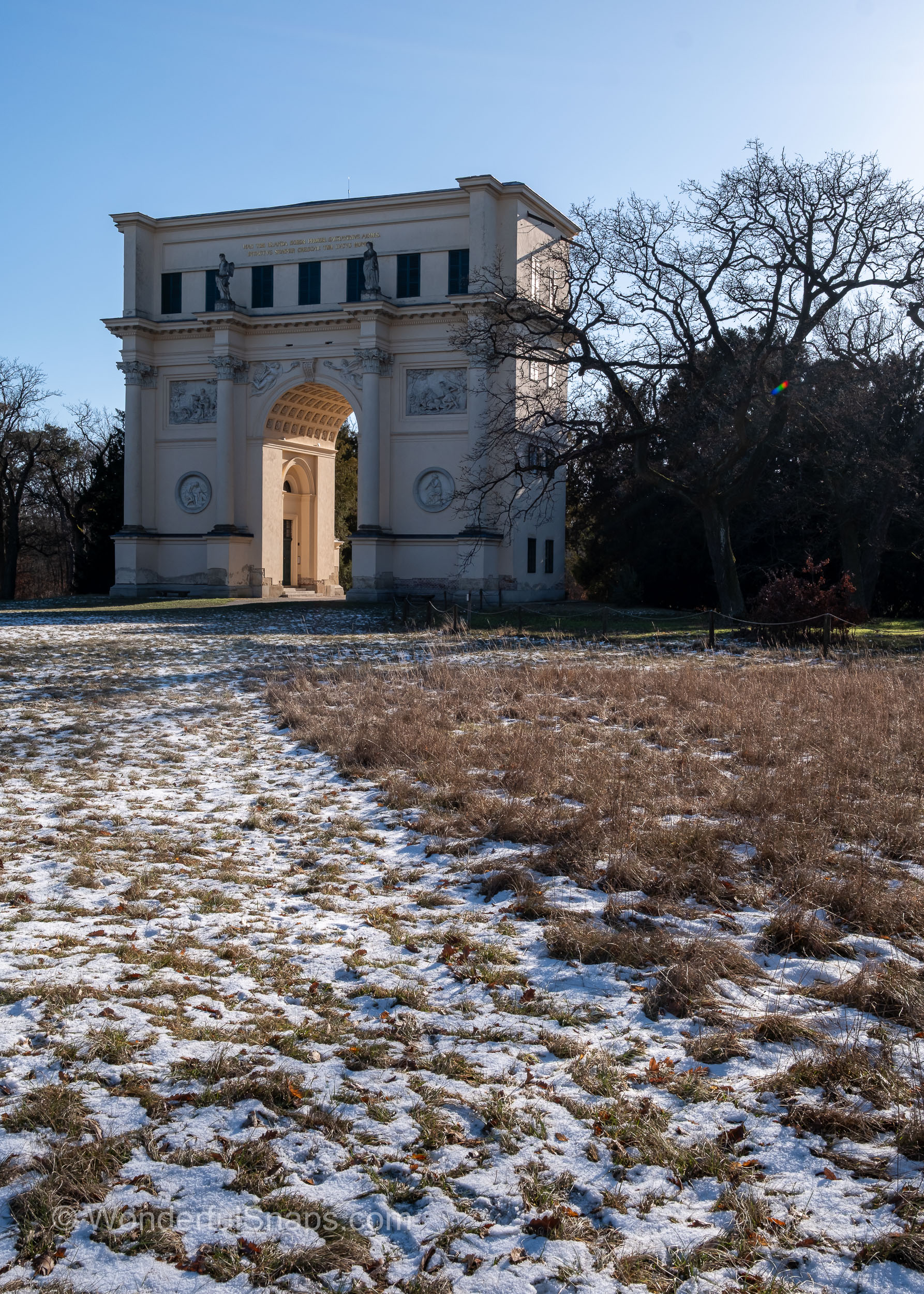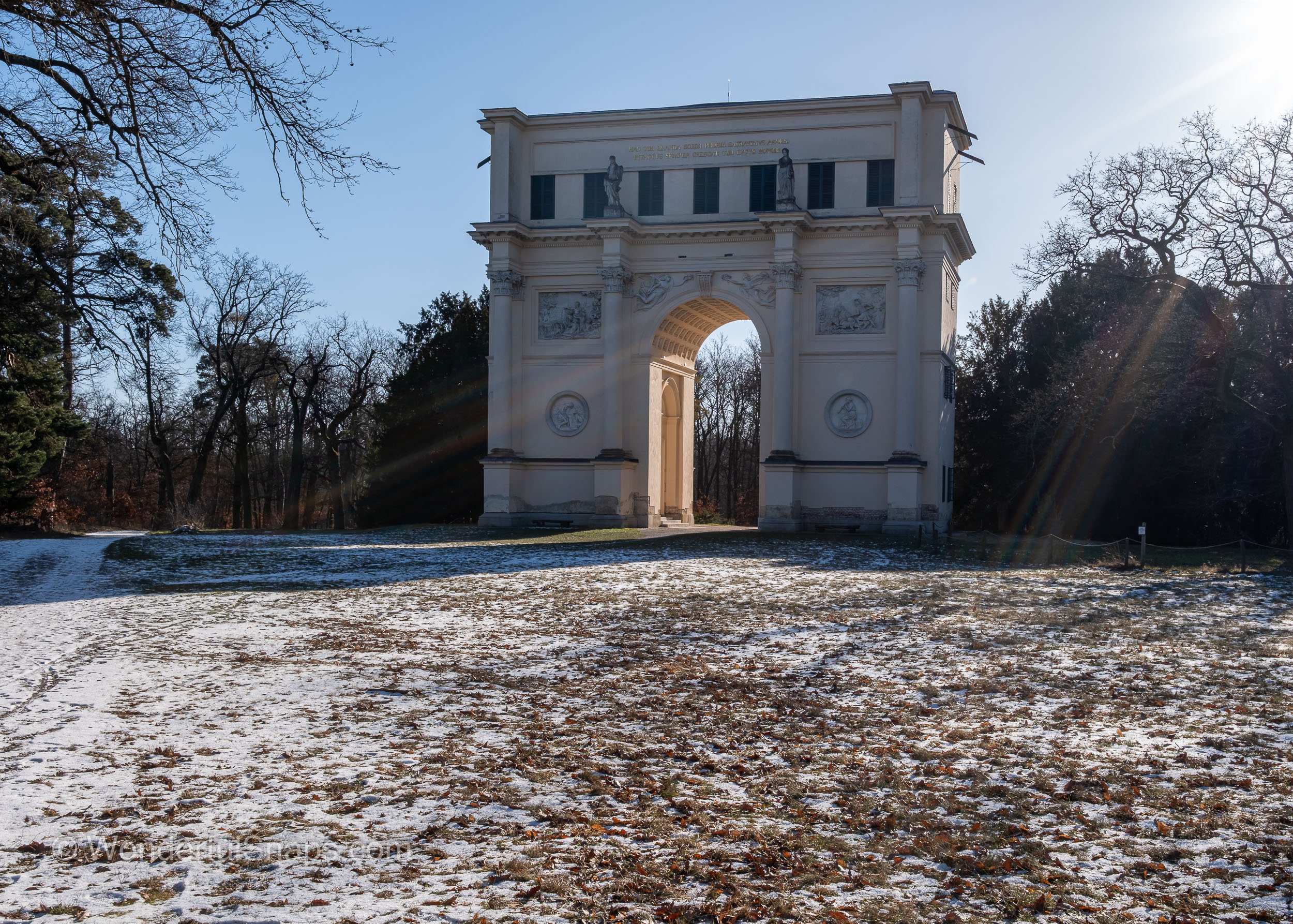 Built at the turn of the 19th century as part of the Lednice–Valtice cultural landscape, the structure reflects the romantic ideals of its time. Sculpted reliefs, columns and statues appear almost sculptural in the low winter light, their pale stone contrasting gently with the blue sky and dark tree lines. The long shadow cast through the central arch draws the eye forward, inviting the visitor to step through and follow the path into the quiet forest behind.