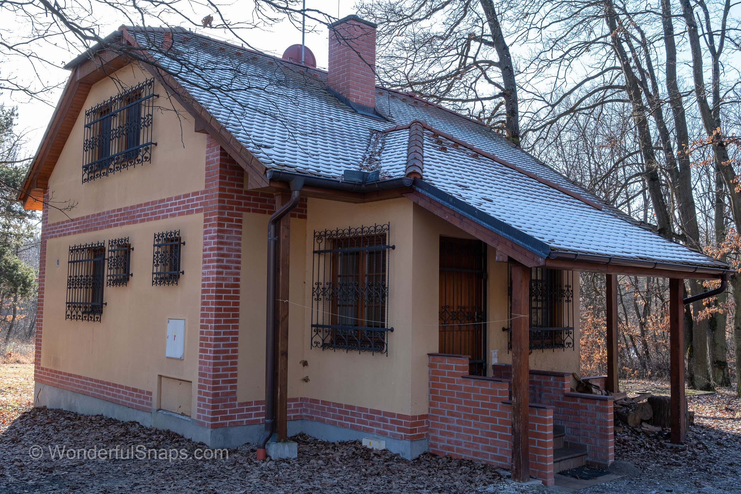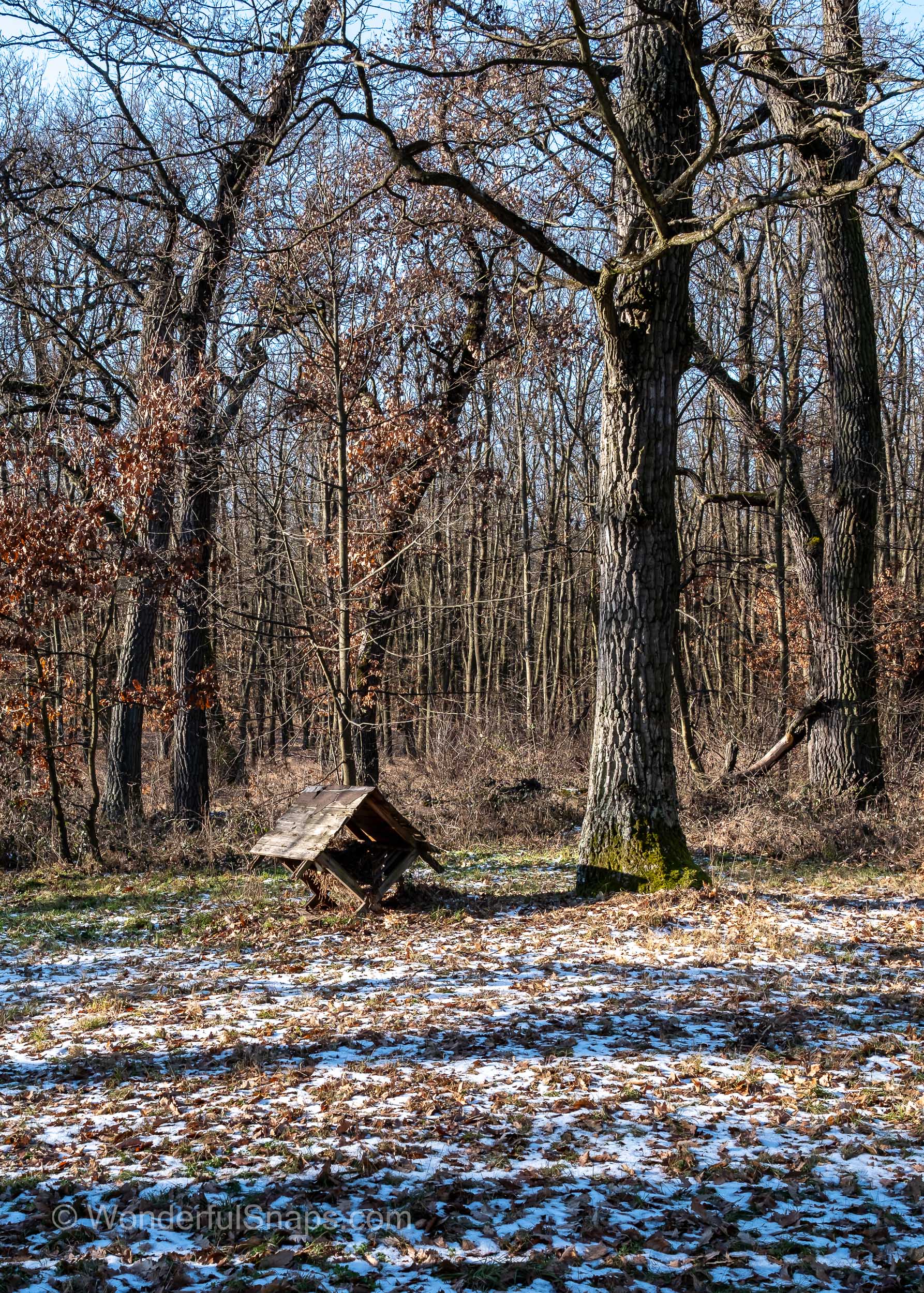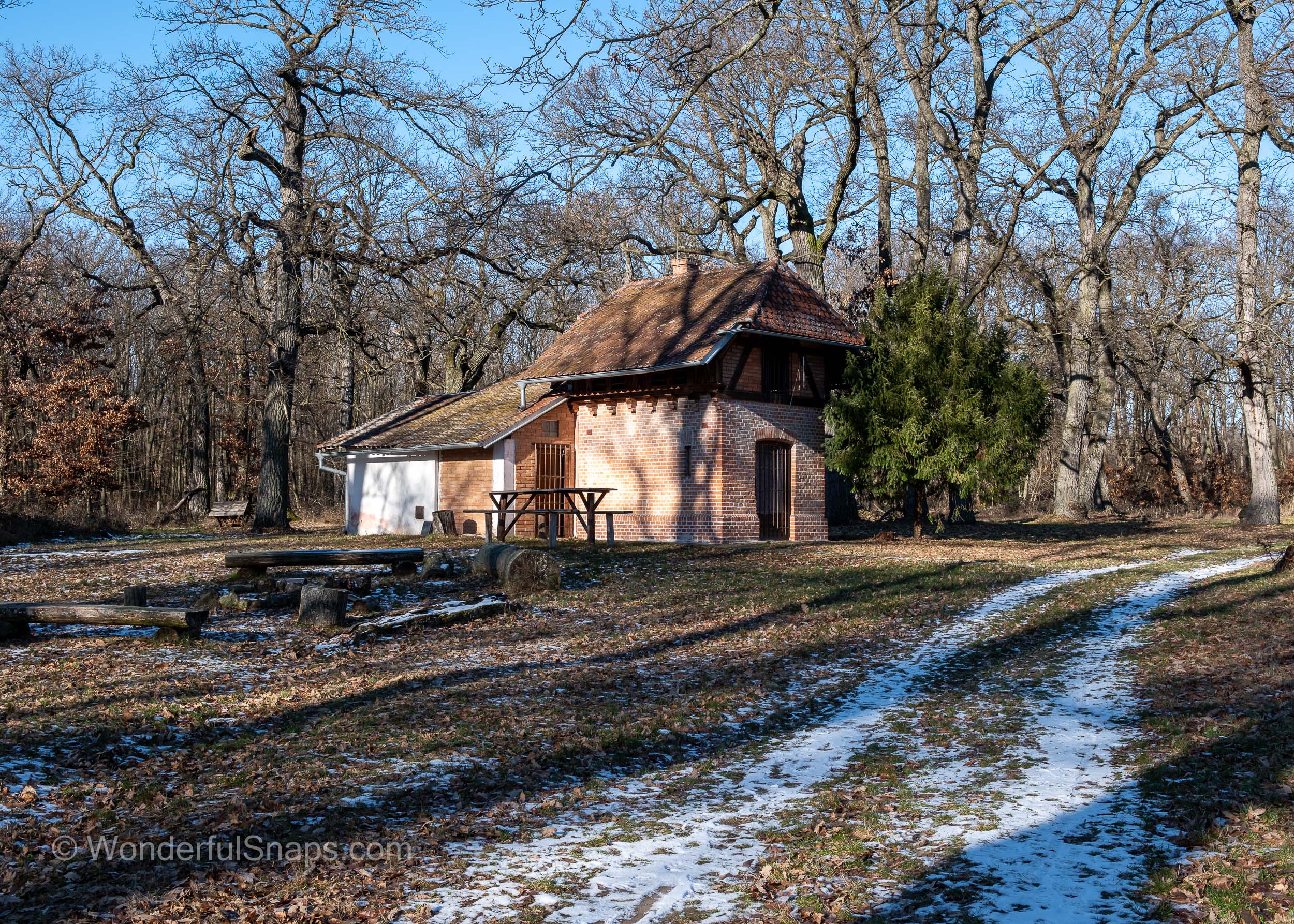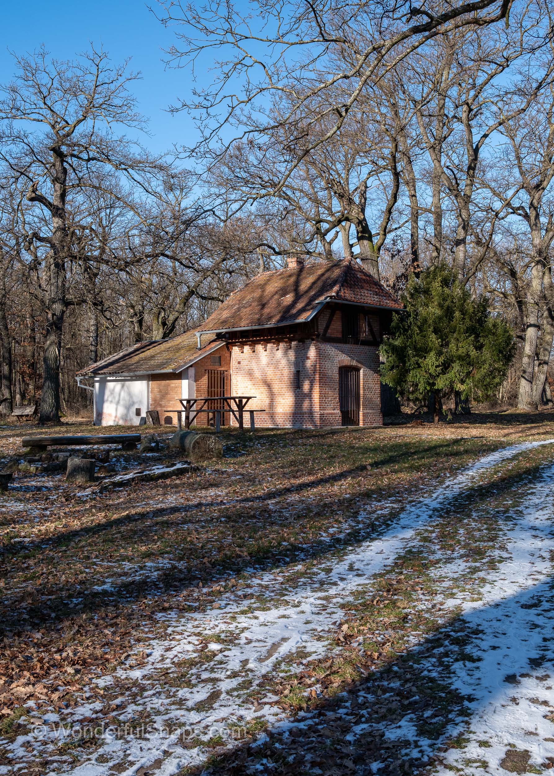 Nearby, modest brick forest buildings and resting places hint at the area’s former function as a hunting ground and social meeting point. In winter, these elements feel more intimate and authentic, free from distraction. Bare oak trees stretch their branches skywards, creating a dense lattice against the sky, while the forest floor is scattered with leaves, frost and traces of snow. Even simple details, such as a wooden feeder or bench, gain significance in the stillness, emphasising the relationship between humans and nature.
