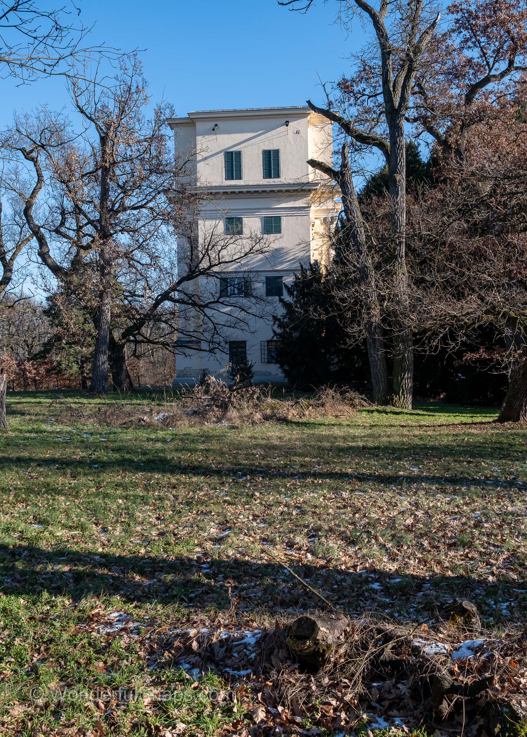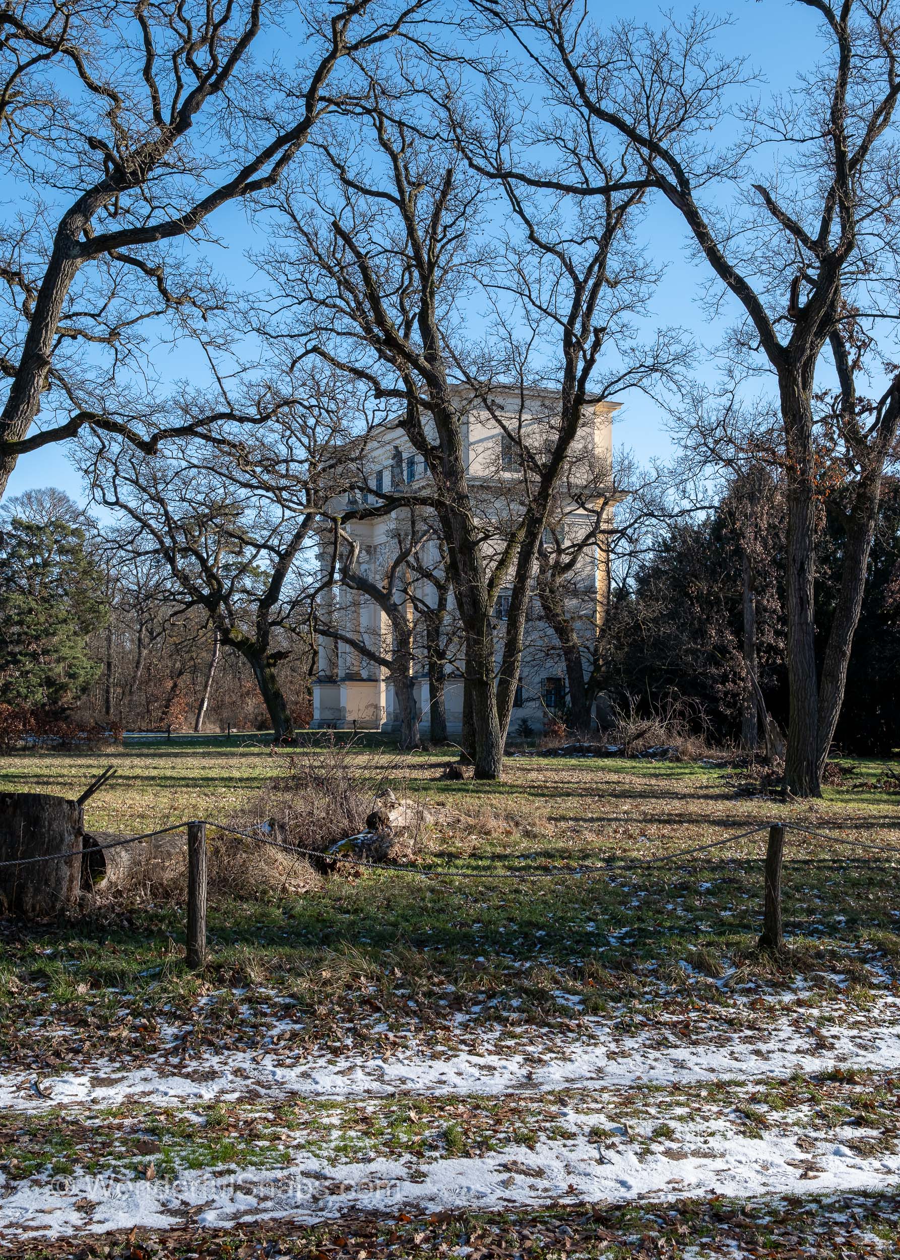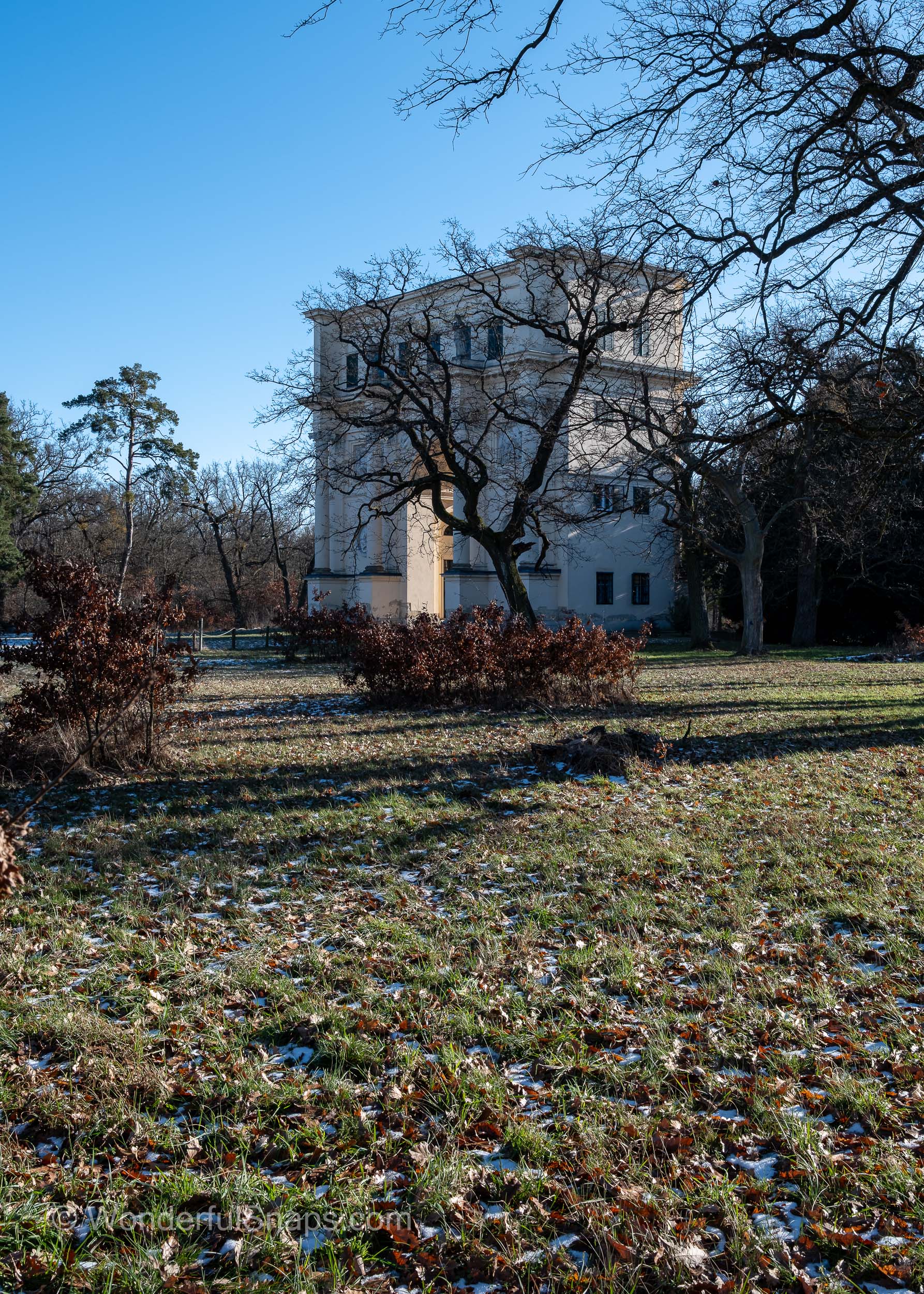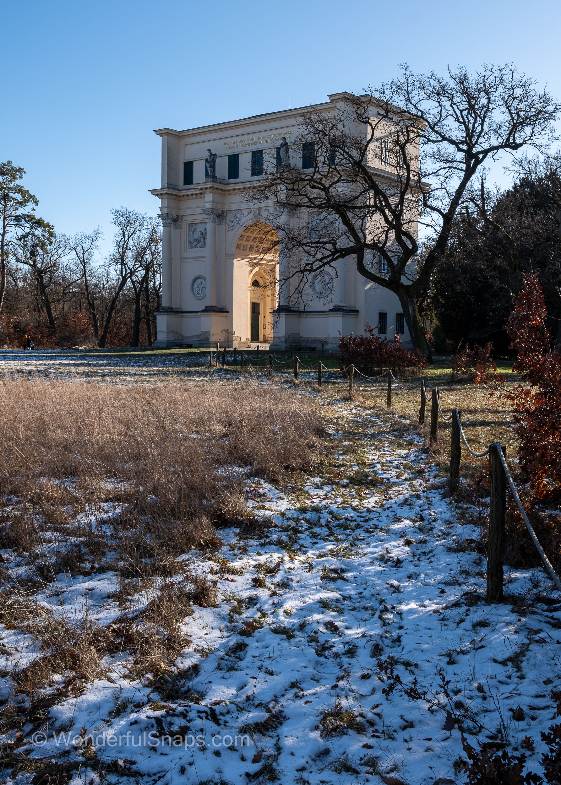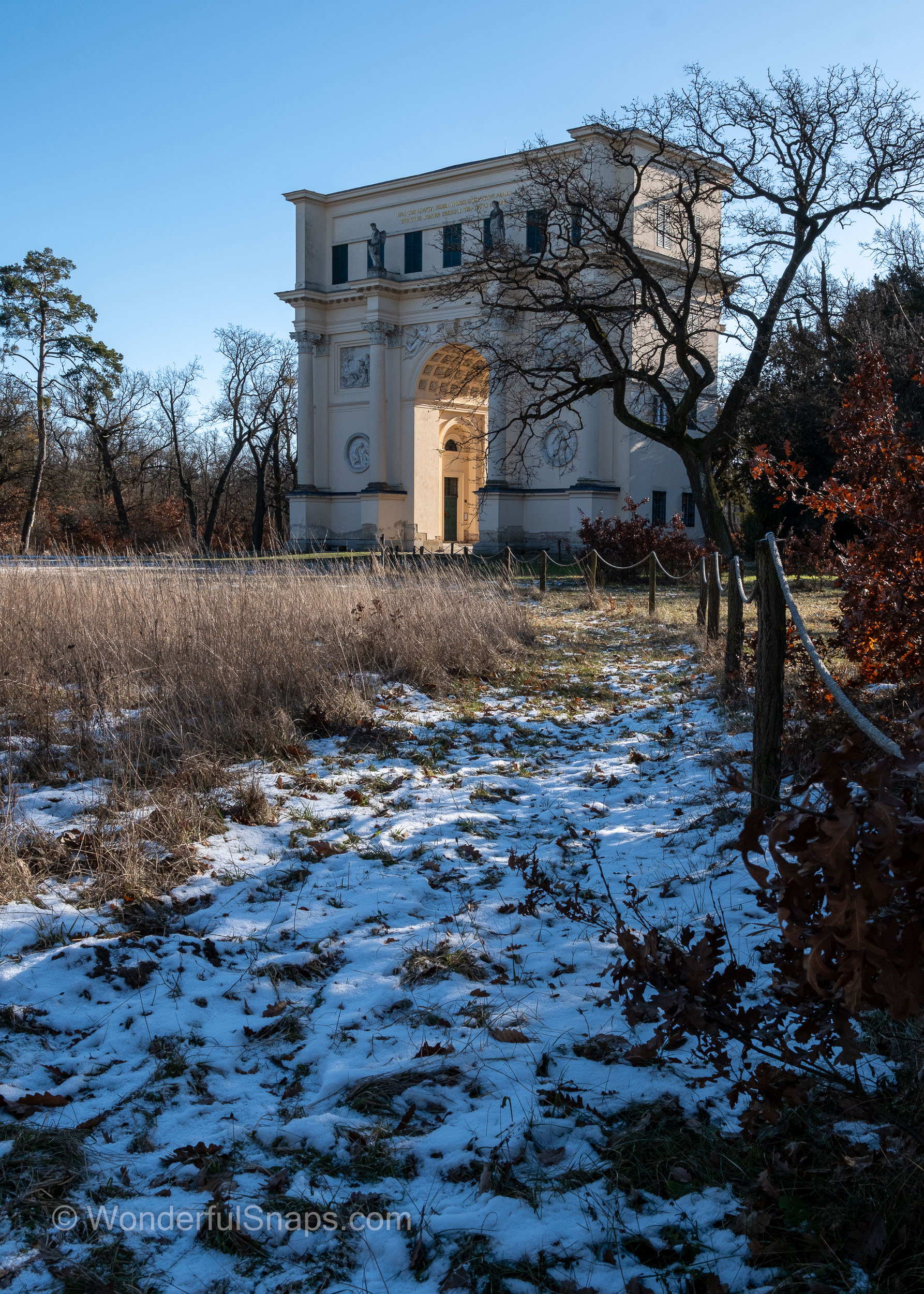 The Temple of Diana, also known as the Rendezvous, stands with quiet dignity on the edge of the forest in South Moravia, revealing a different and more introspective character during winter. Stripped of foliage and softened by a thin dusting of snow, the landscape allows the monument and its surroundings to speak with clarity and restraint. The classical triumphal arch, symmetrical and monumental, rises from the frozen grass like a gateway between the cultivated world and the untamed woodland beyond.